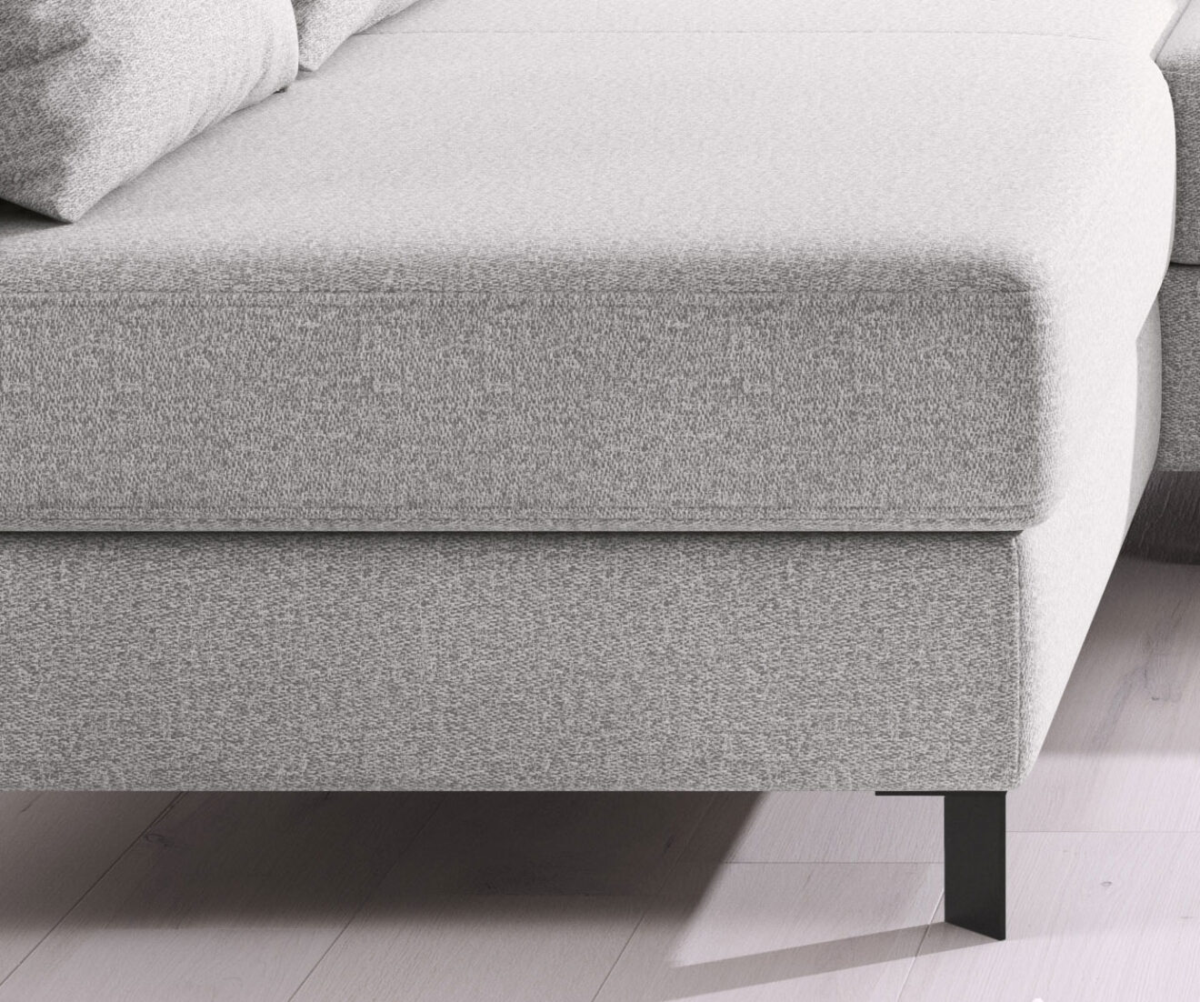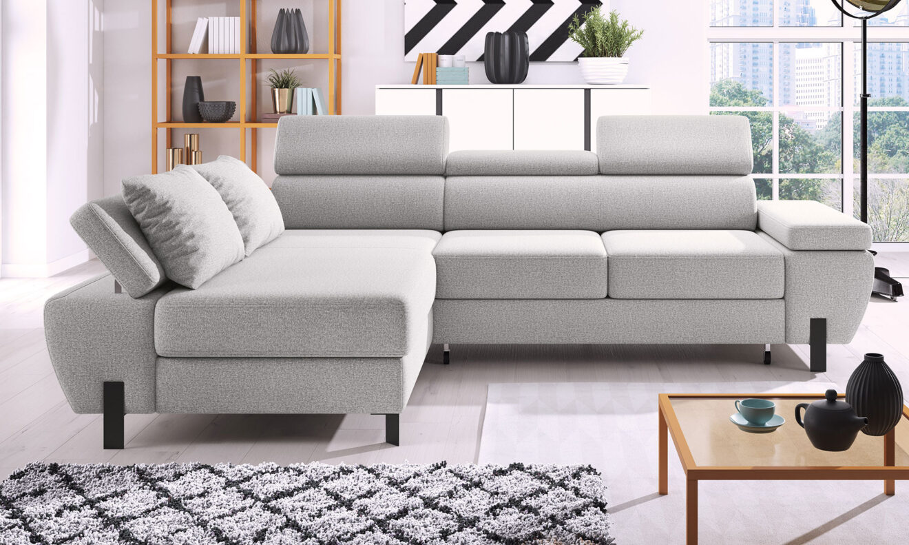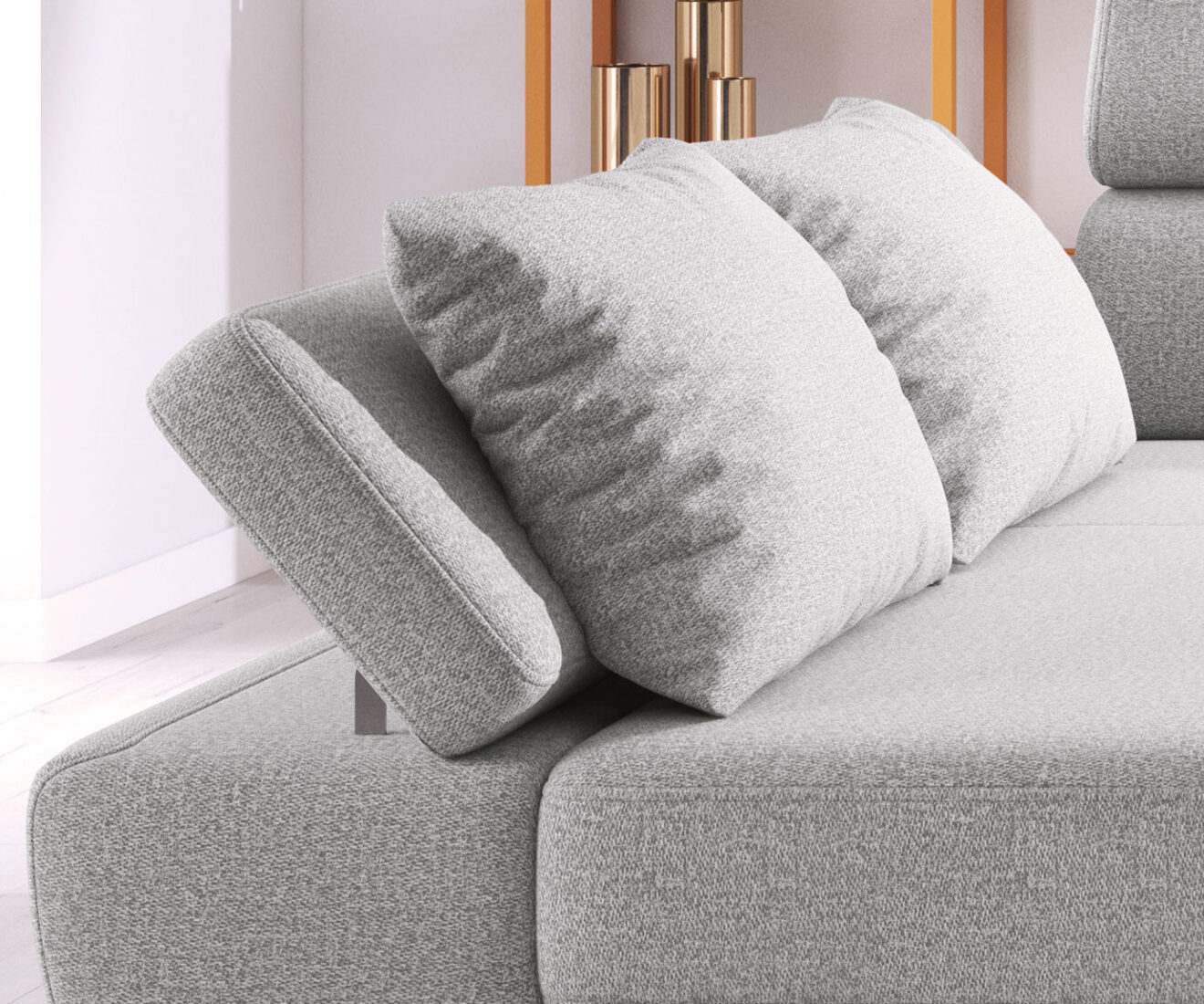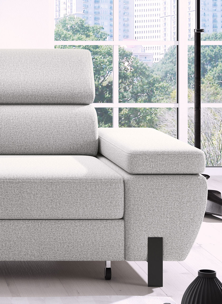 Molina ist für alle gedacht, die modernes Design, Komfort und Funktionalität schätzen. Die originellen Metallbeine unterstreichen den einzigartigen Charakter dieses Möbelstücks. Bequeme Rückenlehnen mit verstellbaren Kopfstützen und eine bewegliche Armlehne ermöglichen es jedem im Haus, sich so zu entspannen, wie er möchte. Die Schlaffunktion ist eine Lösung für alle, die einen zusätzlichen Platz zum Ausruhen suchen und in dem großen Staufach, das in der Ottomane versteckt ist, können Sie zusätzliches Bettzeug und eine warme Decke aufbewahren.