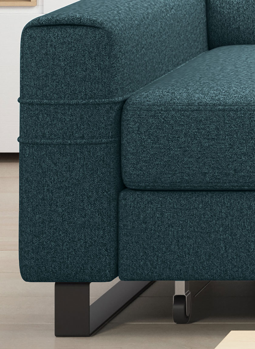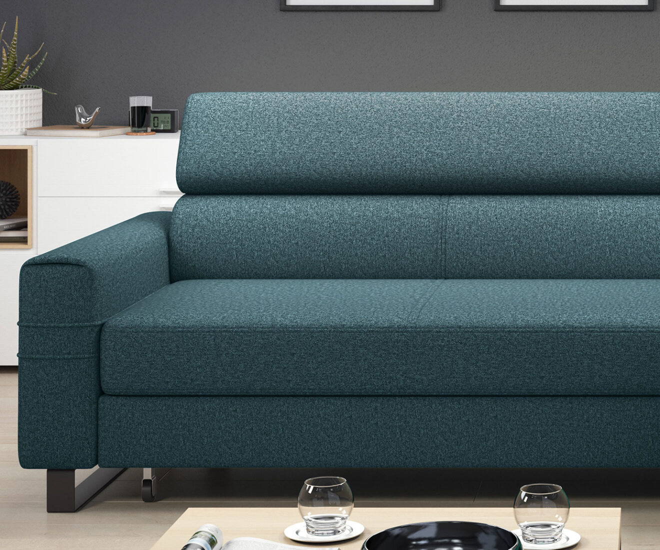 Livio combines modern design with the functionality of lounge furniture. Straight side with delicate stitching, raised on a metal runner, smooth seat, and movable headrests combined with a sleeping function and a large bedding container are features that will satisfy users looking for comfort and practical solutions.