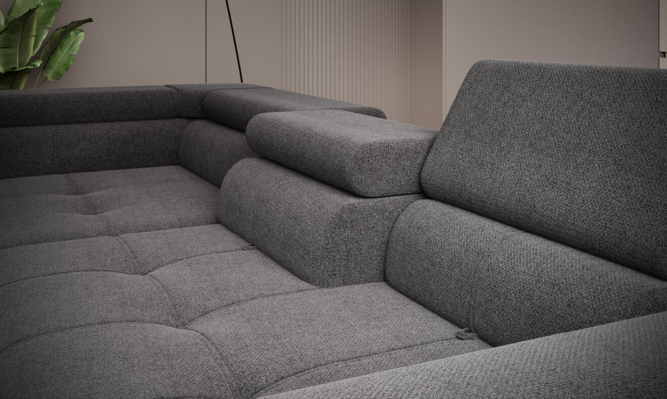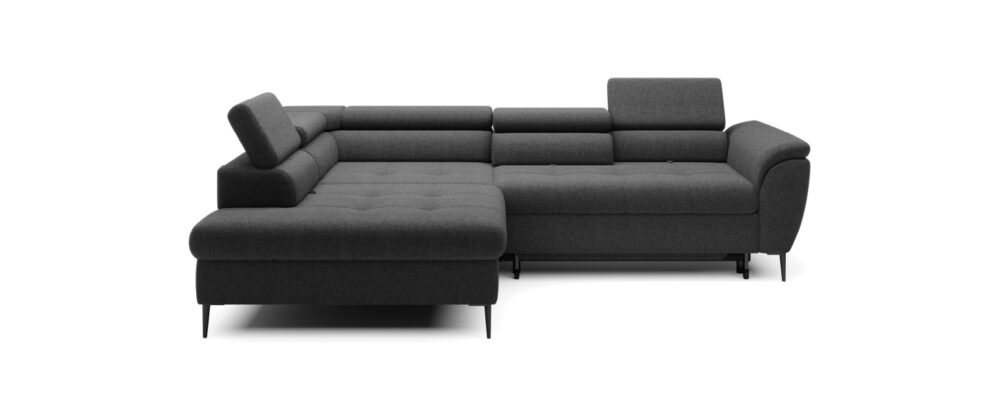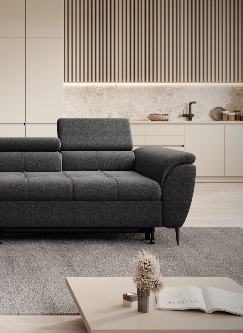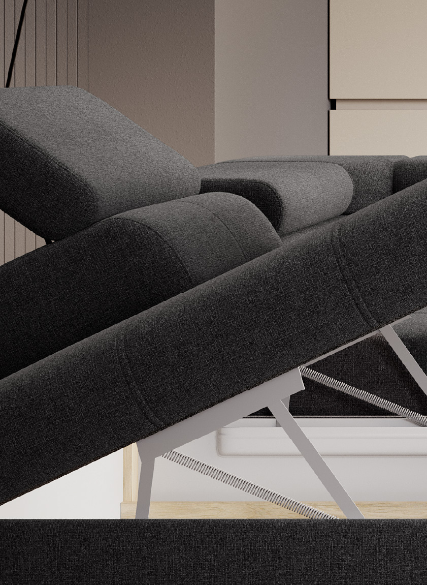 TEMPO – is a classic corner model concealing many functions. In addition to its unquestionable visual effect, this model boasts sliding backrests, allowing you to easily adjust the depth of the seat to suit your individual needs. The headrests can be gradually adjusted, increasing the comfort of the furniture. TEMPO can easily become a sleeping spot thanks to the DELFIN system. The bedding container provides storage for extra blankets and pillows.