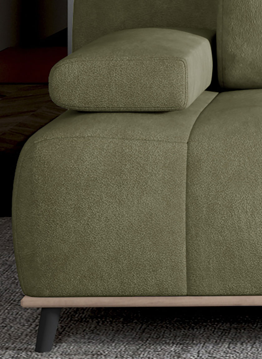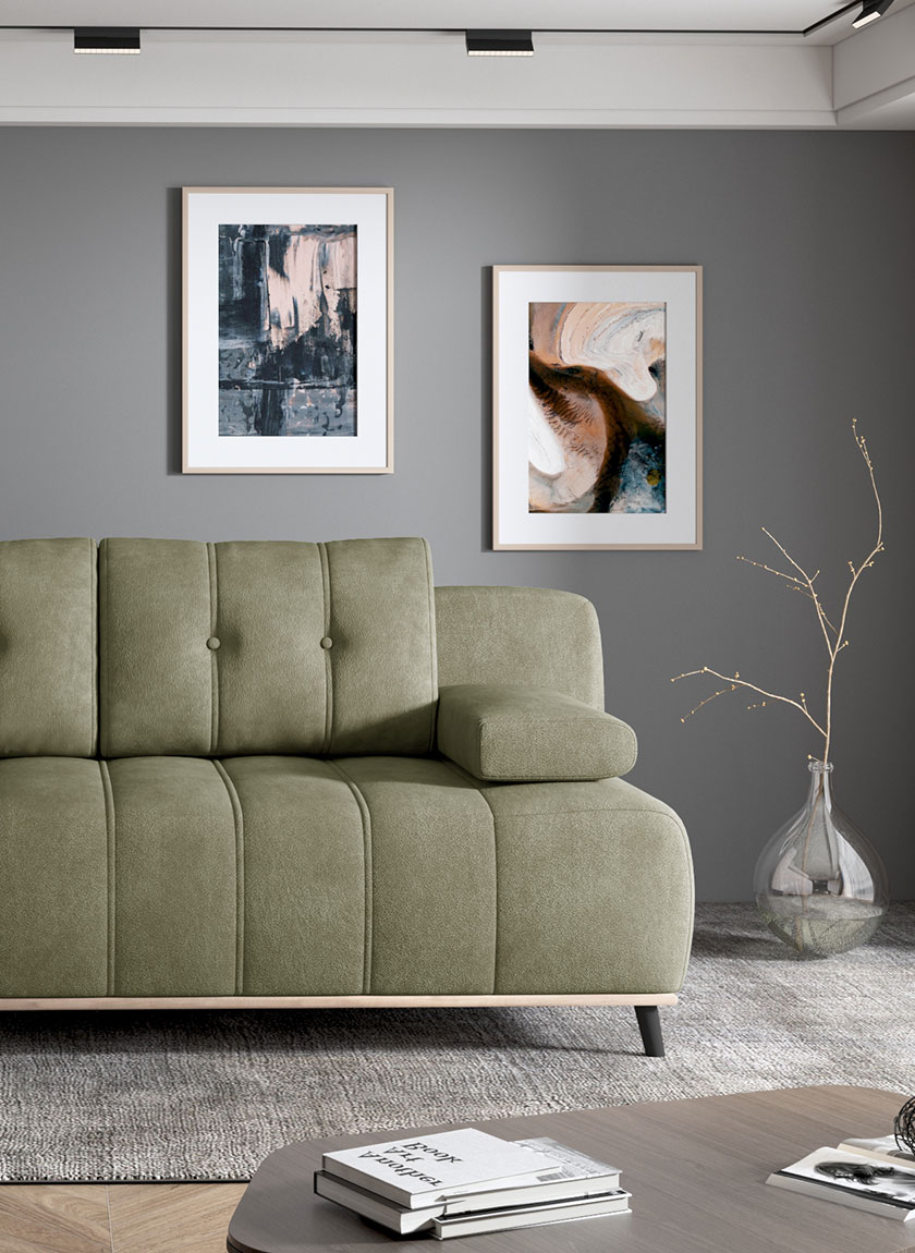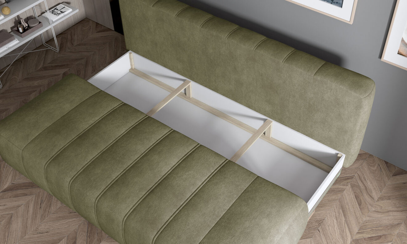 An extremely comfortable sofa, equipped with a DL sleeping function and a large storage compartment for additional bedding. The characteristic stitching on the seat and backrest, accentuated with delicate quilting, give the piece of furniture its charm, while the high legs and wooden decorative element under the seat emphasise the lines of the piece of furniture.