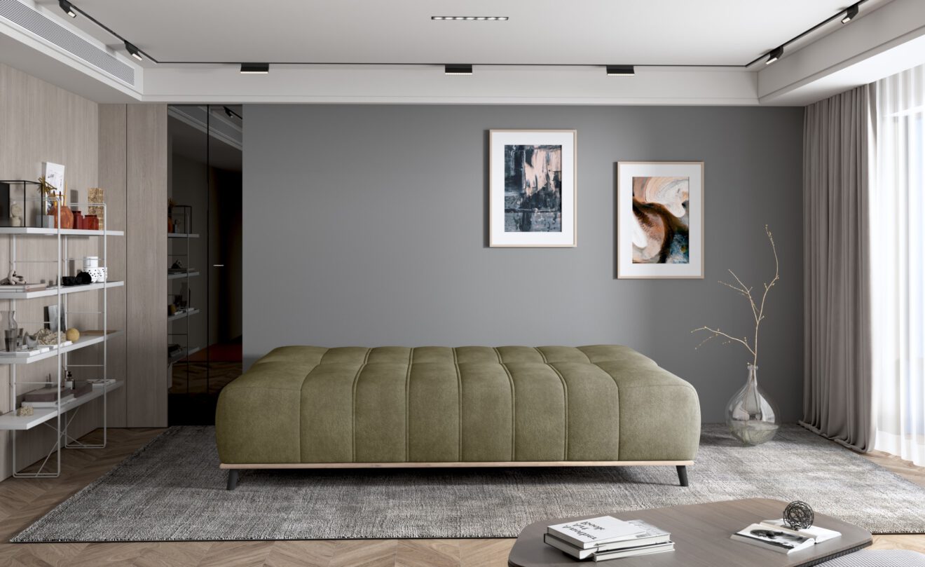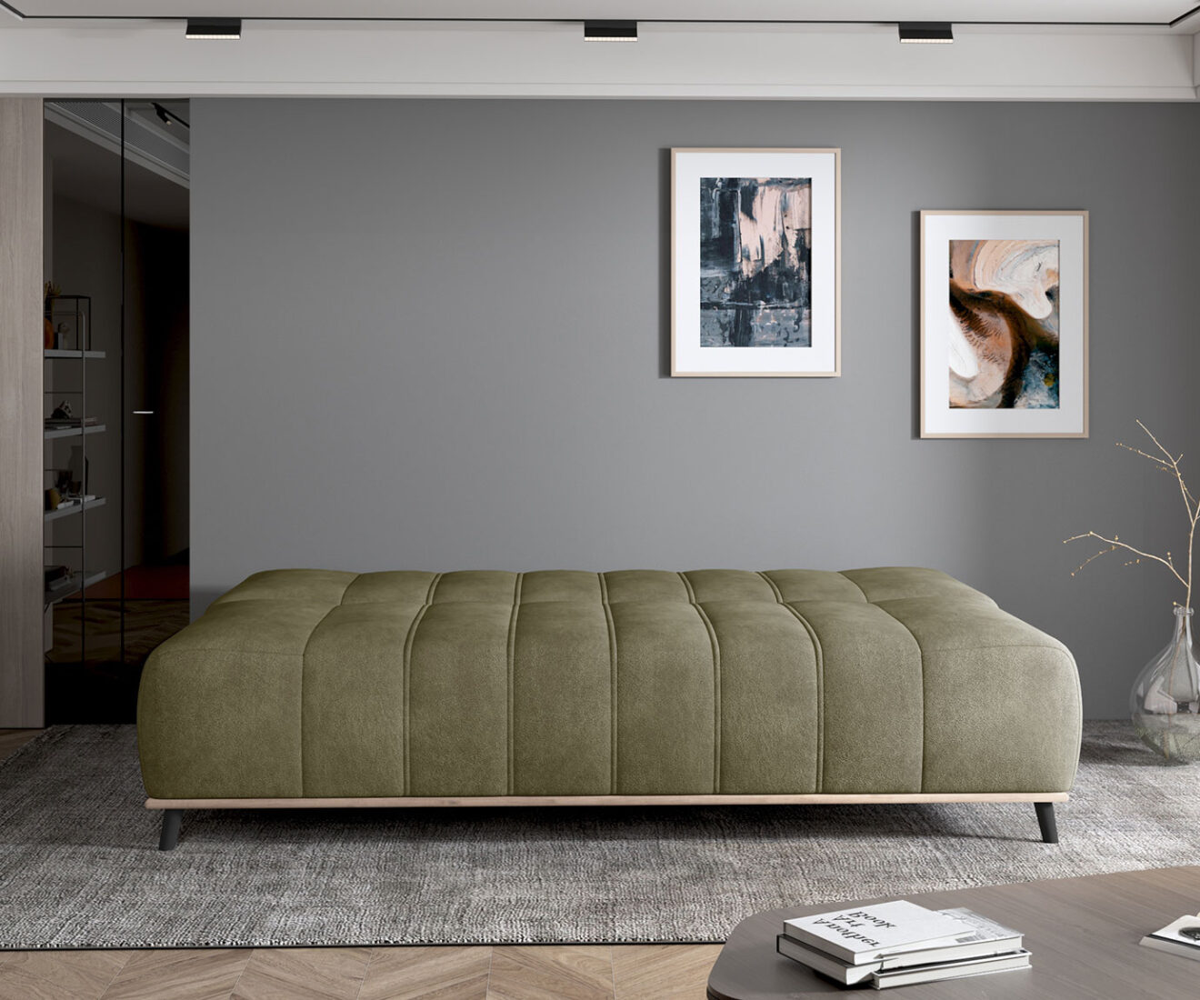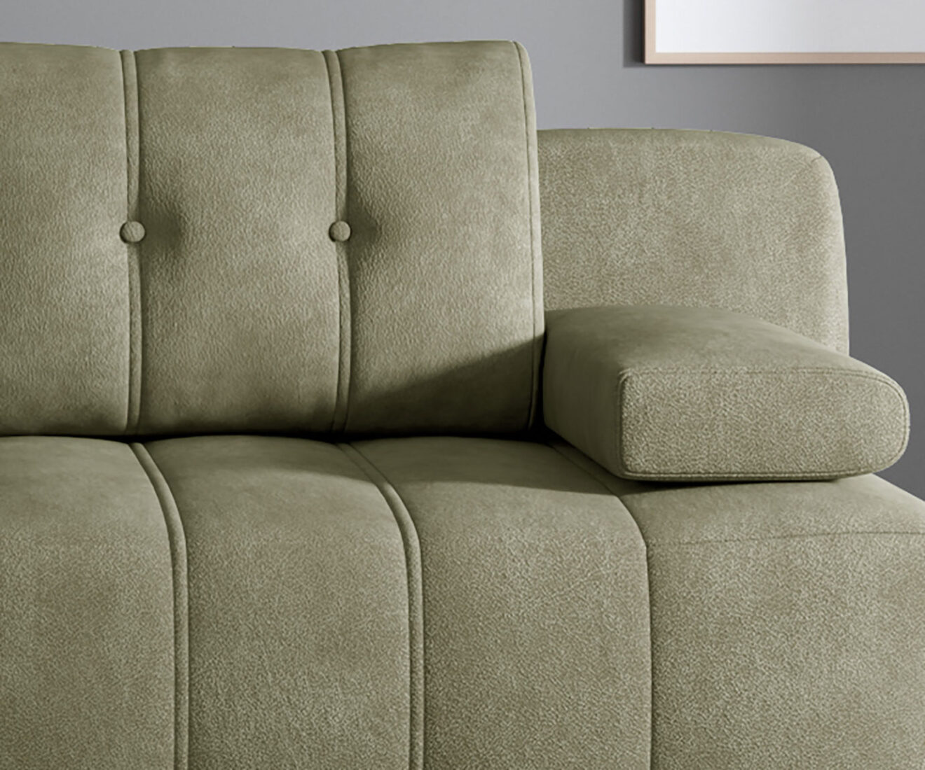 An extremely comfortable sofa, equipped with a DL sleeping function and a large storage compartment for additional bedding. The characteristic stitching on the seat and backrest, accentuated with delicate quilting, give the piece of furniture its charm, while the high legs and wooden decorative element under the seat emphasise the lines of the piece of furniture.