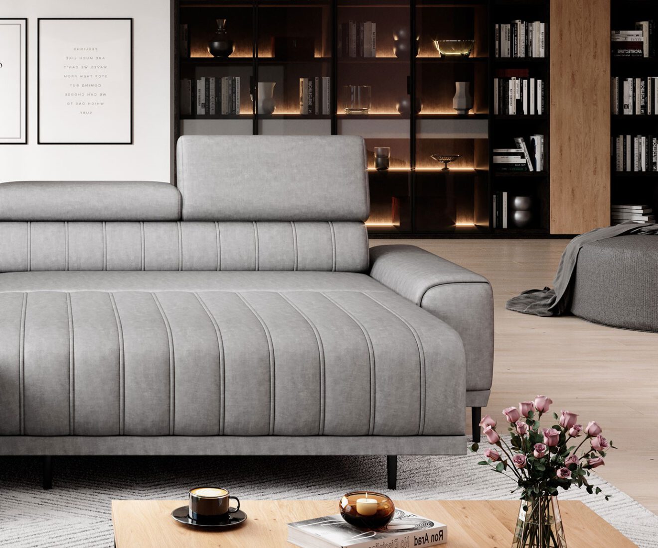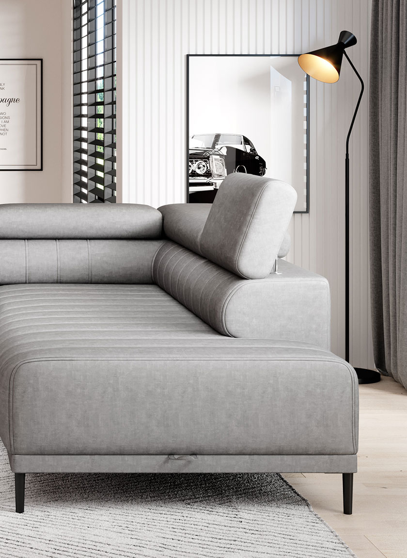 CALDO – est un canapé d’angle qui se distingue par ses coutures verticales. Les têtières réglables permettent d’adapter le repos aux besoins individuels de l’utilisateur. Grâce au système de dépliage PUMA, ce canapé d’angle se transforme efficacement en lit avec une surface de couchage de 140×200 cm. Caché sous l’ottoman, le bac à literie permet de ranger couvertures et coussins.