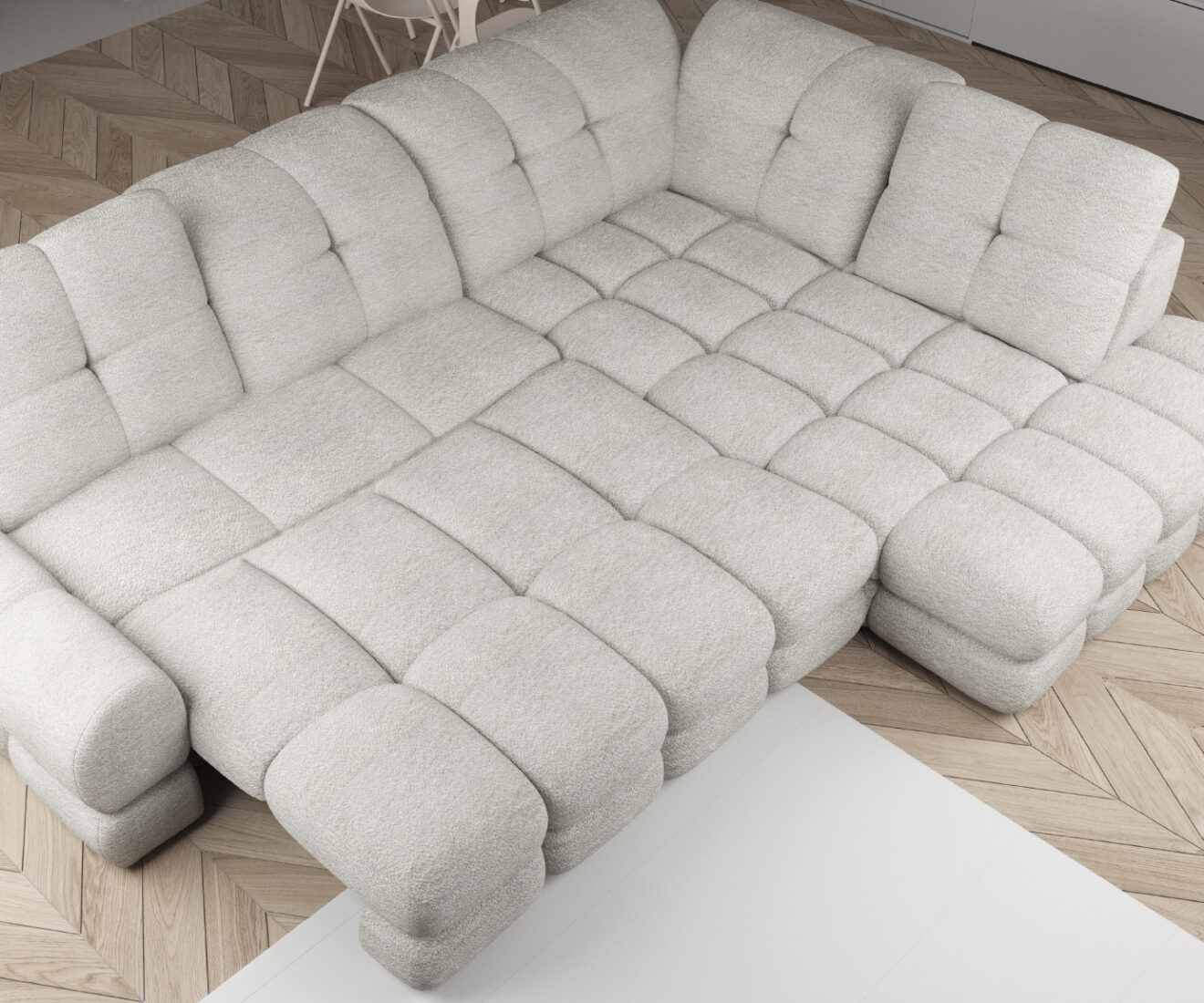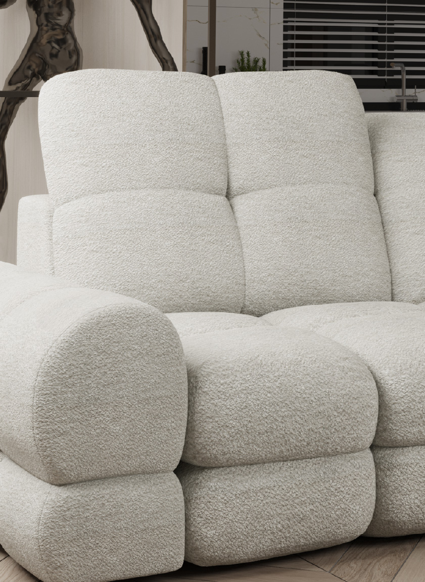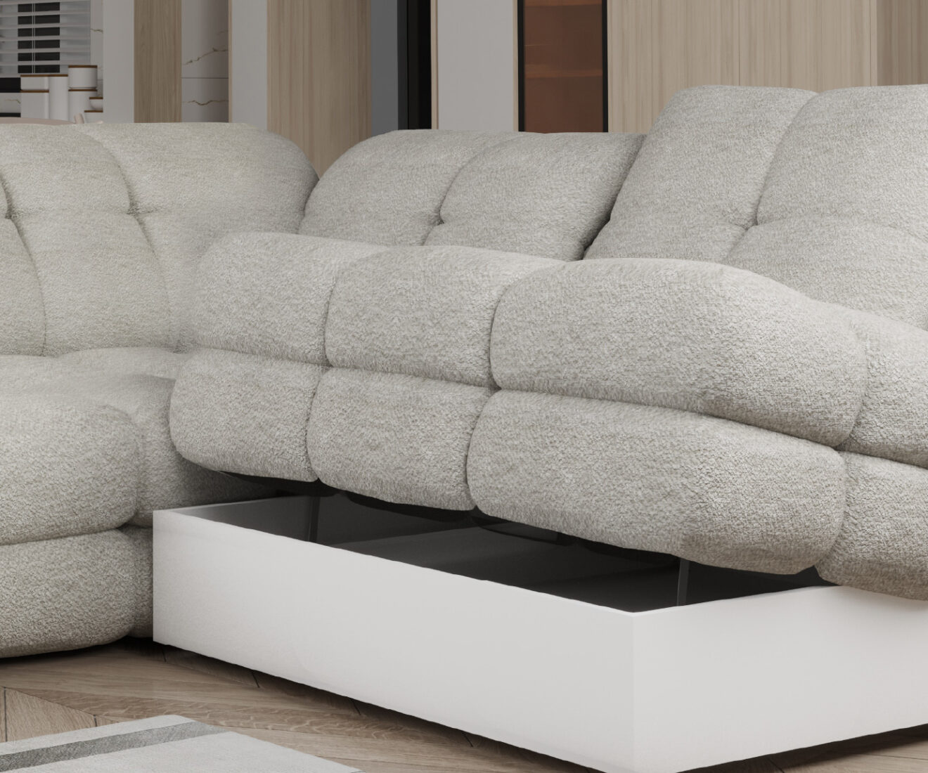 Il s’agit d’un canapé d’angle conçu selon les dernières tendances. L’assise massive et confortable, rehaussée de surpiqûres profondes, confère à ce meuble un aspect original et inédit. Les têtières réglables permettent d’ajuster l’angle d’inclinaison, améliorant ainsi la qualité d’utilisation. L’utilisation des inserts SUPERLONG 0-60 cm permet de créer une surface de couchage confortable. Un avantage supplémentaire est le conteneur caché dans l’ottoman, où l’on peut ranger des oreillers ou une couverture chaude.