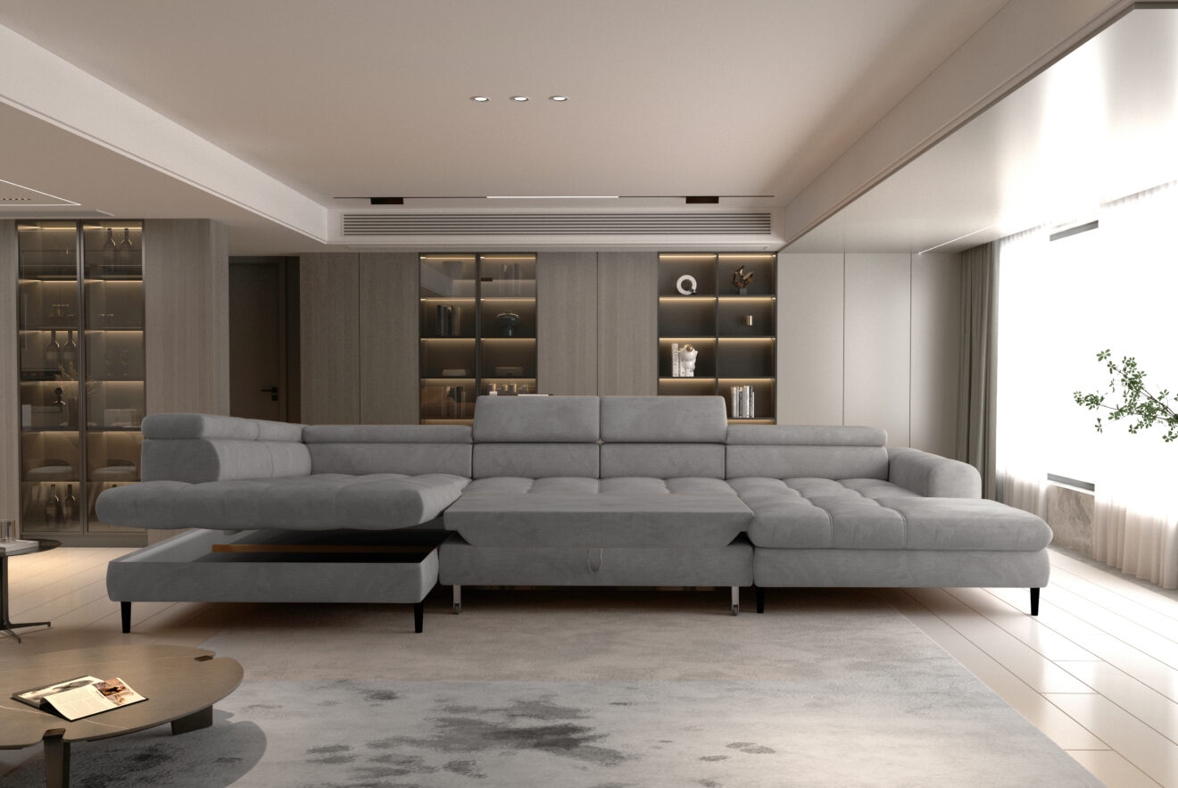 VOSS XL est un canapé d’angle conçu pour ceux qui apprécient le style, le confort et les solutions pratiques. Doté d’une fonction de couchage qui se déplie en quelques secondes ainsi que d’un grand espace de rangement, il est parfait pour les salons où chaque centimètre d’espace intelligemment utilisé compte. Les appuie-têtes réglables permettent d’adapter la hauteur du dossier à vos besoins – d’une détente totale à un confort actif pour lire ou travailler. La structure est complétée par des pieds hauts, qui apportent légèreté à la silhouette et s’intègrent parfaitement dans les intérieurs élégants et modernes.