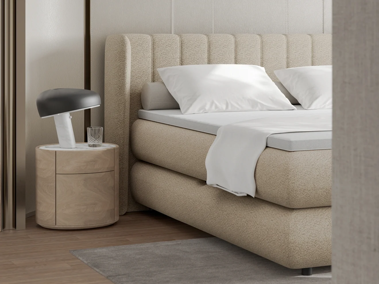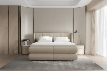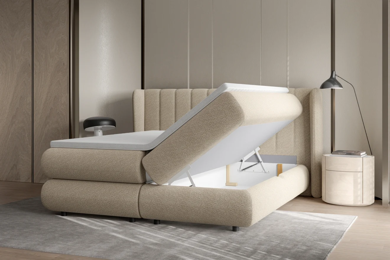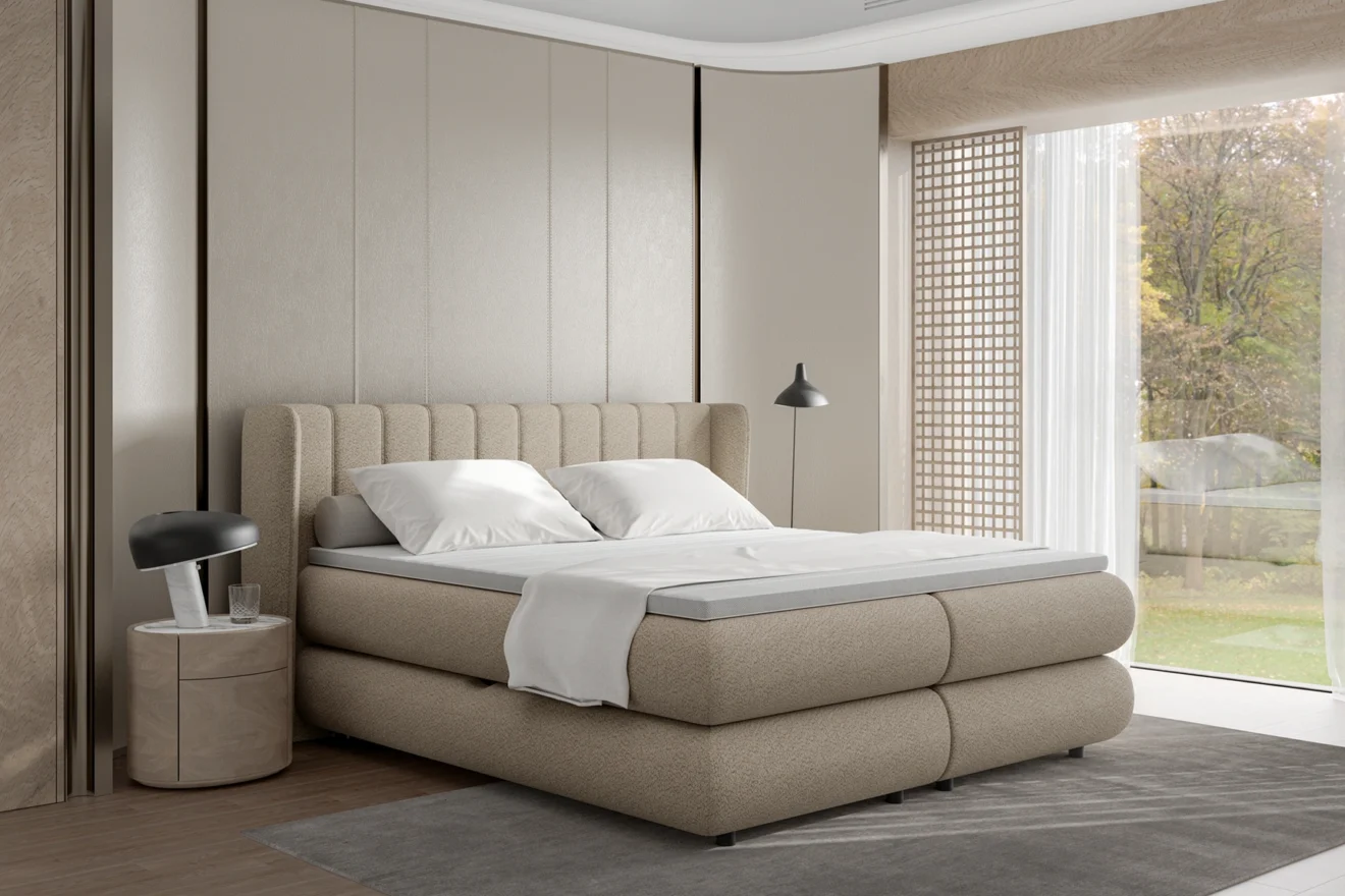 ELISE przyciąga uwagę nietuzinkowym zagłowiem o miękkiej, zagiętej formie. Jego nowoczesna linia nadaje wnętrzu lekkości i elegancji. Funkcjonalny pojemnik na pościel pozwala wygodnie zagospodarować przestrzeń. To propozycja łącząca design z codzienną praktycznością.