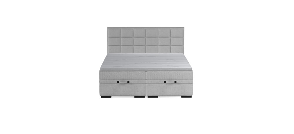 SEMENO to funkcjonalne łóżko z dwoma pojemnikami na pościel, zapewniające wygodny dostęp dzięki praktycznym uchwytom z przodu. Zagłowie zdobią przeszycia w kształcie kwadratów, nadające całości geometrycznego charakteru. To model łączący komfort, nowoczesny styl i praktyczne rozwiązania.