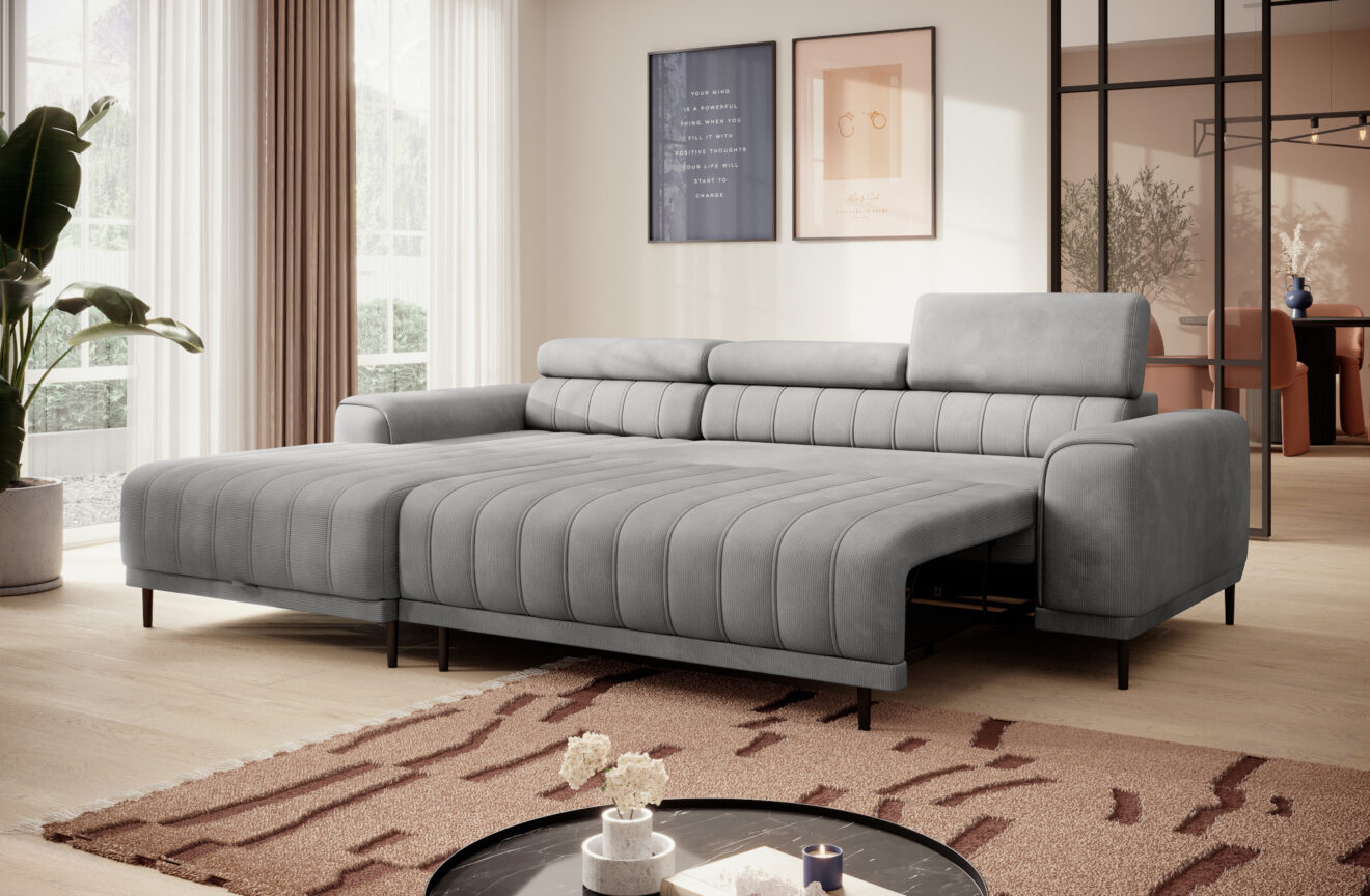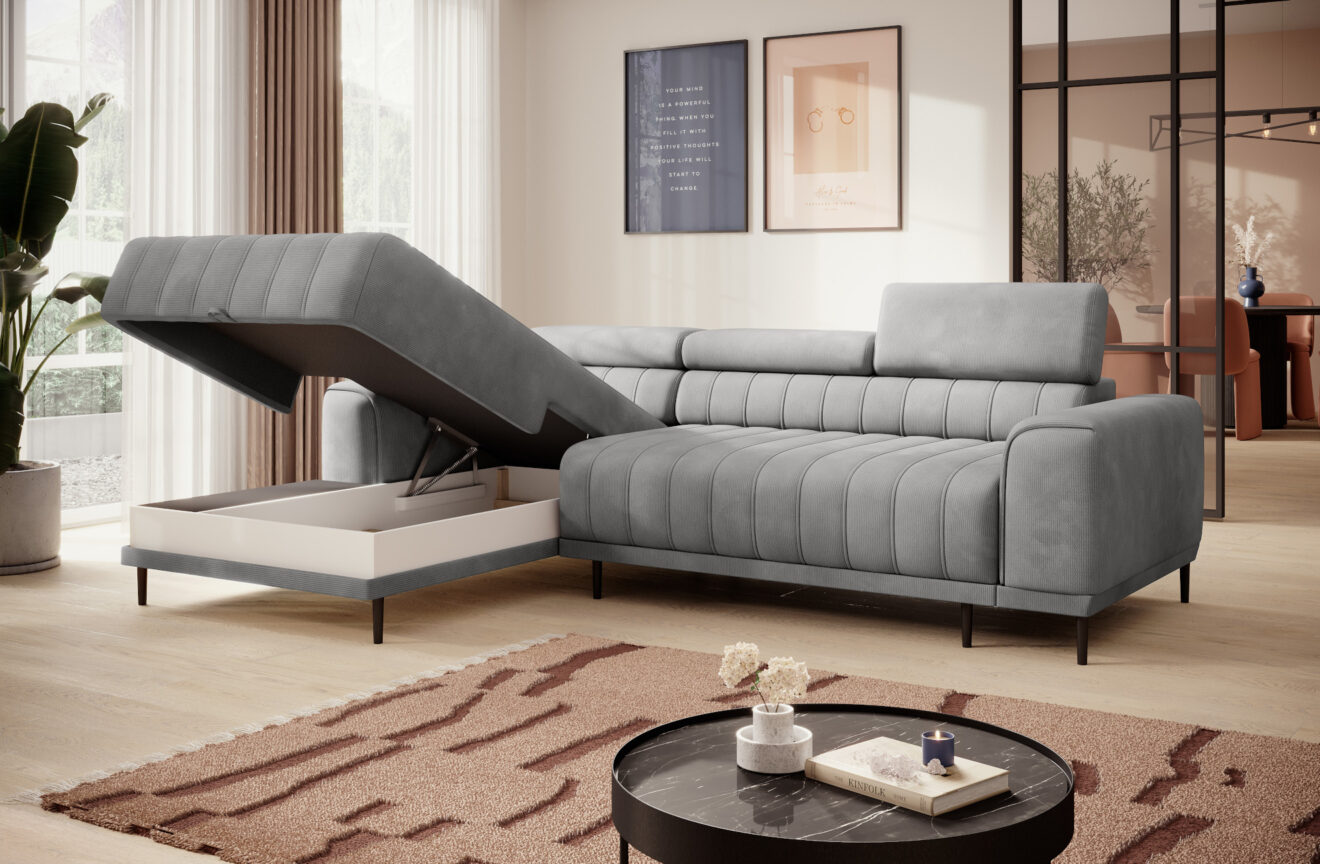 CALDO MINI – to narożnik wyróżniający się pionowymi przeszyciami. Regulowane zagłówki umożliwiają dostosowanie wypoczynku do indywidualnych potrzeb użytkownika. Dzięki systemowi rozkładania PUMA, narożnik ten w sprawny sposób zmienia się w łóżko o powierzchni spania 215×136 cm. Ukryty pod otomaną pojemnik na pościel umożliwia przechowywanie kocy i poduszek.