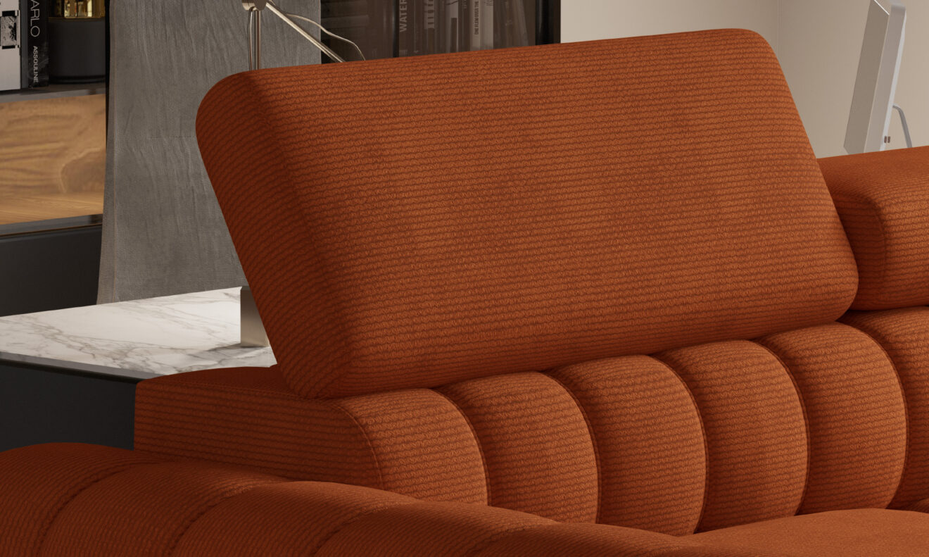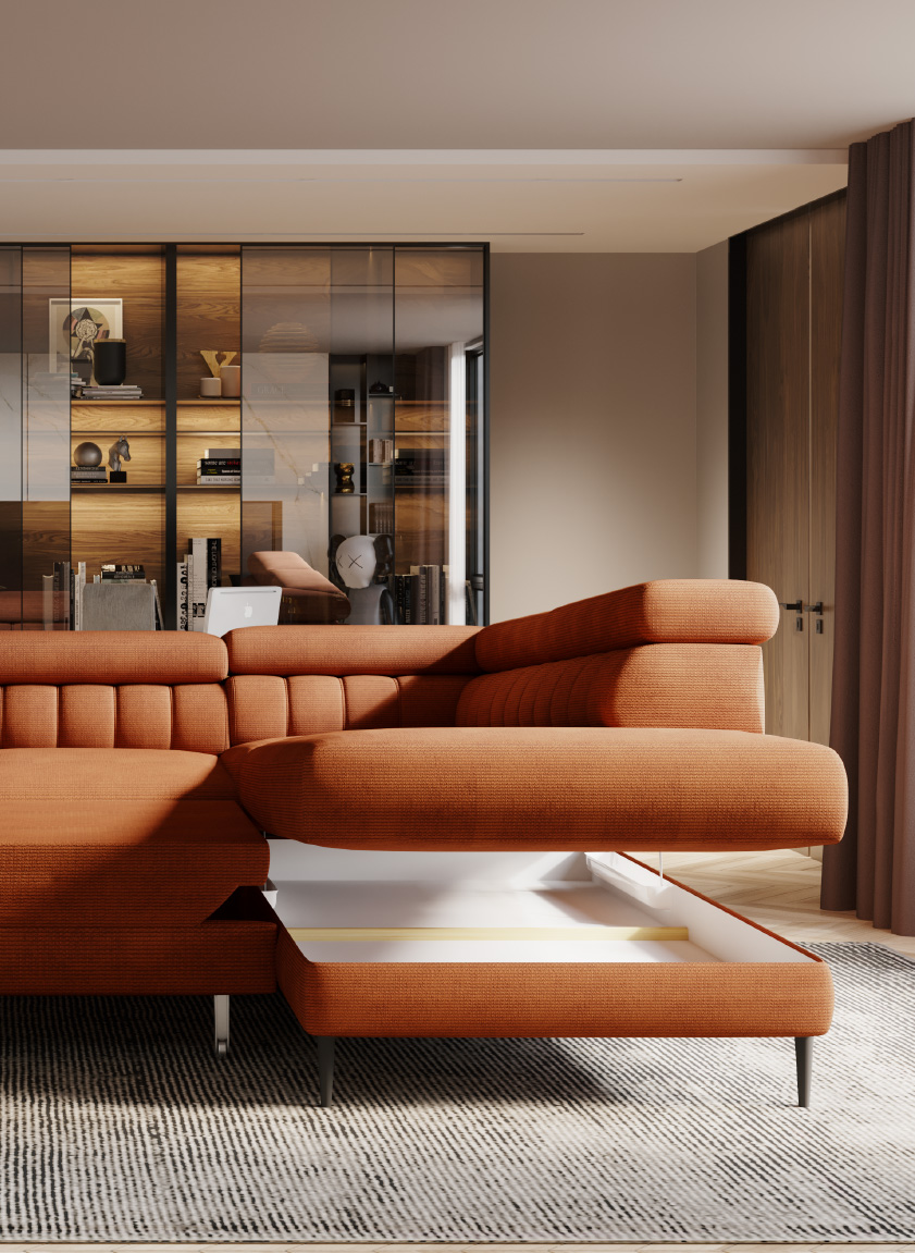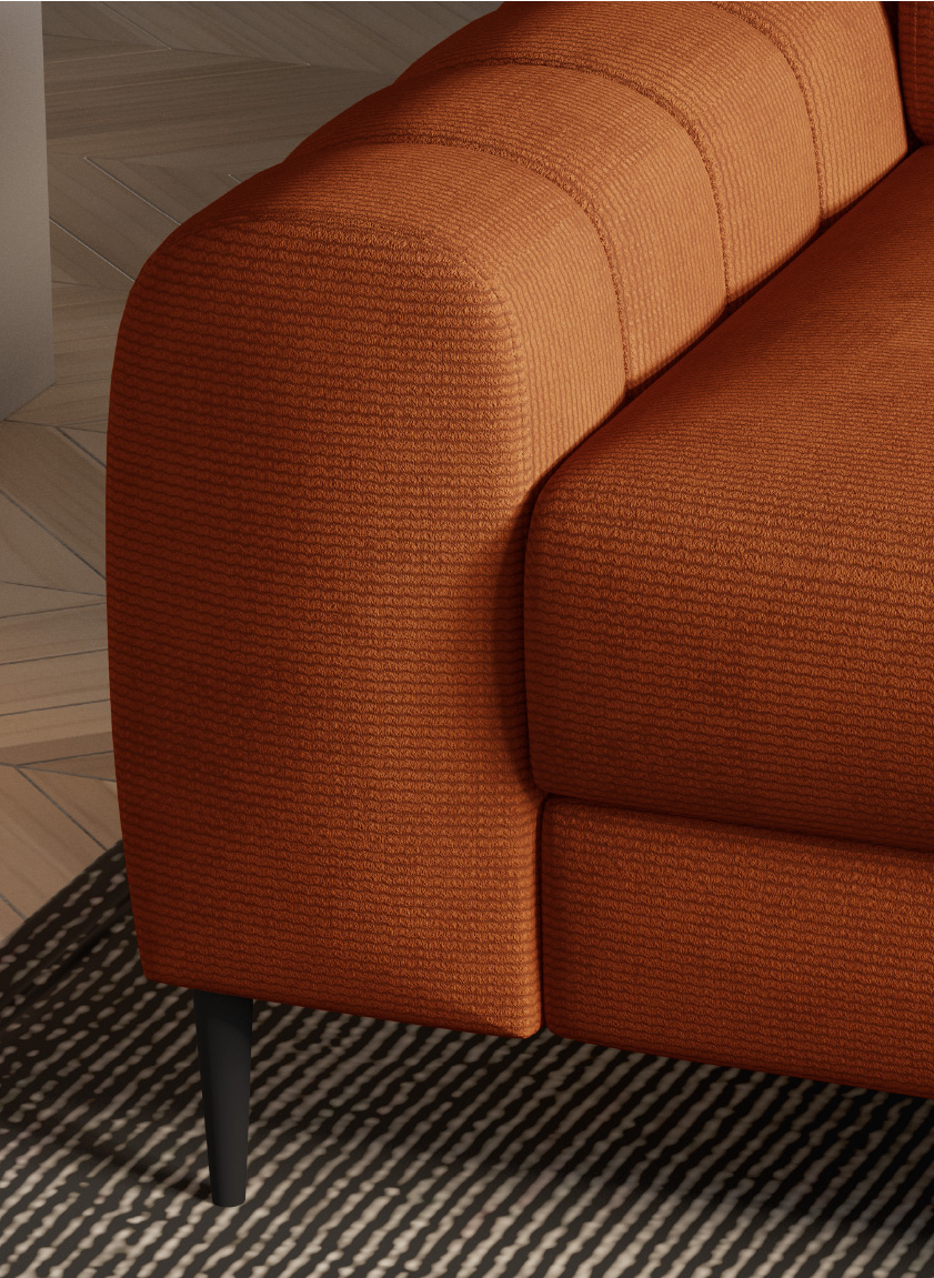 Kompaktowy, niezwykle komfortowy i funkcjonalny narożnik Navas to doskonały wybór do mniejszych salonów. Funkcja spania pozwoli na wypoczynek w dzień i w nocy a pojemnik ukryty w otomanie to idealny schowek na dodatkową pościel. Navas posadowiono na czarnych nogach, które podkreślają nowoczesny styl mebla.
